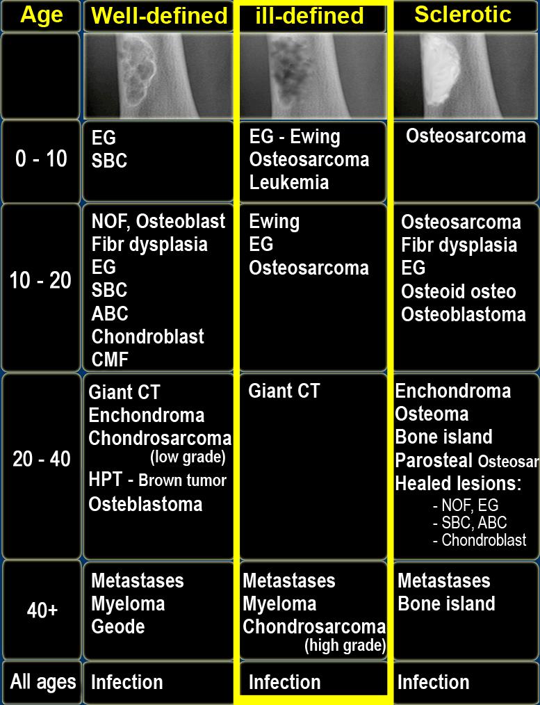 Bên trái là các khối u xương và tổn thương giả u xương có giới hạn không rõ ràng phổ biến nhất.