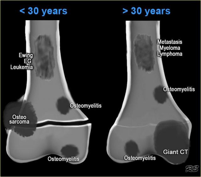 Chẩn đoán phân biệt (tùy theo độ tuổi): Sarcoma Ewing, viêm tủy xương và u lympho xương.