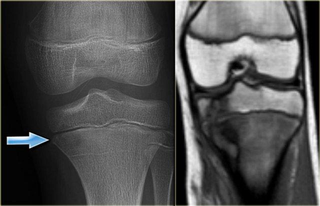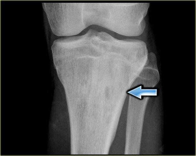 Có thể thấy một tổn thương lệch tâm, ranh giới không rõ ở cả hai phía của đĩa sụn tăng trưởng tại đầu trên xương chày.
