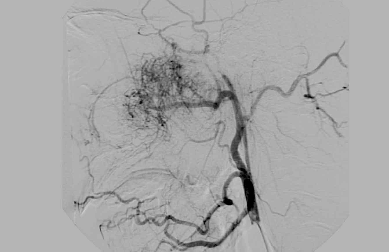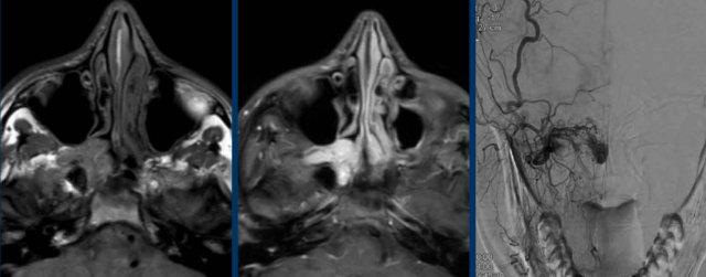 Hình ảnh DSA cho thấy tình trạng tăng sinh mạch máu, điều này (kết hợp với vị trí đặc trưng) gợi ý mạnh mẽ cho chẩn đoán u xơ mạch máu vị thành niên.
