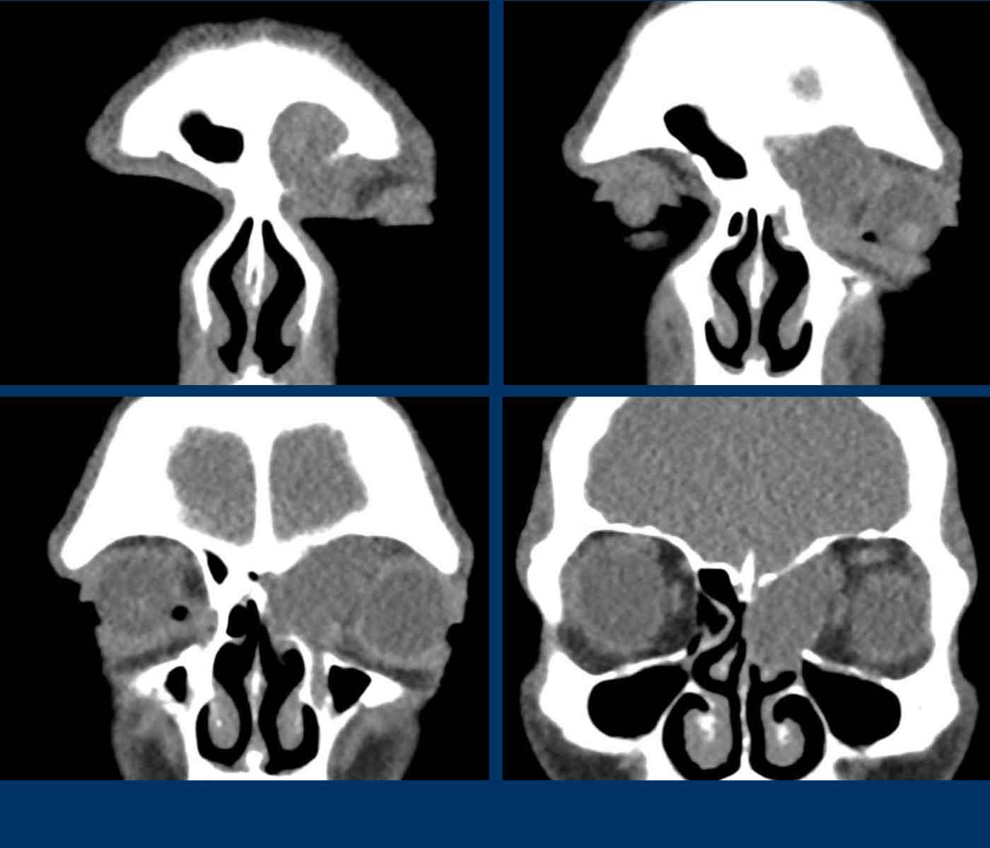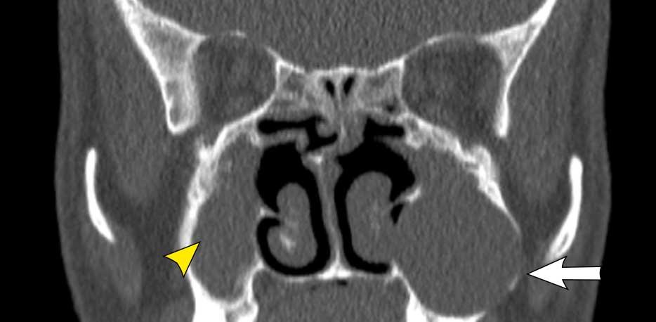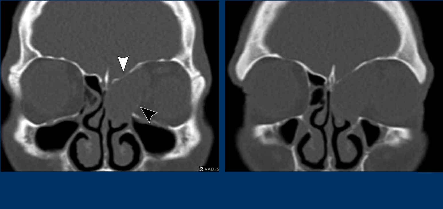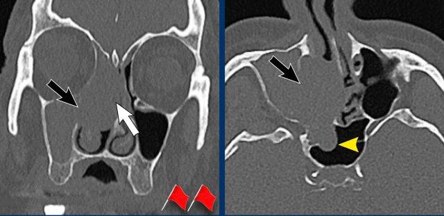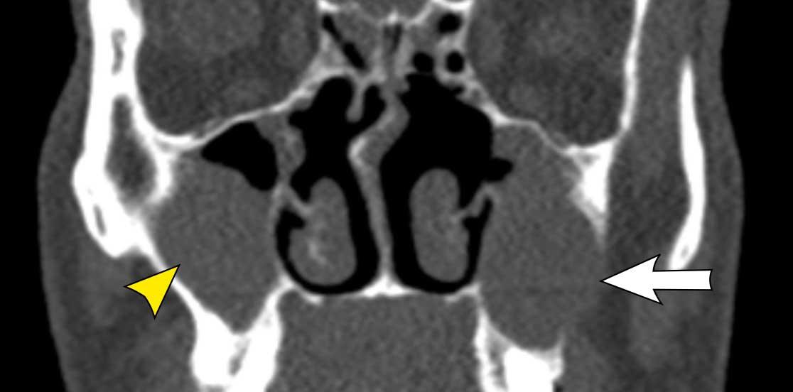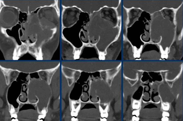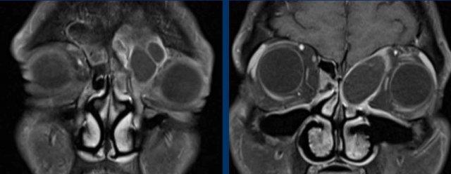 Ở bệnh nhân viêm mũi xoang, có thể có giãn rộng và đôi khi thậm chí phá hủy xương, nhưng bệnh lý (hầu như) luôn luôn xảy ra hai bên.
