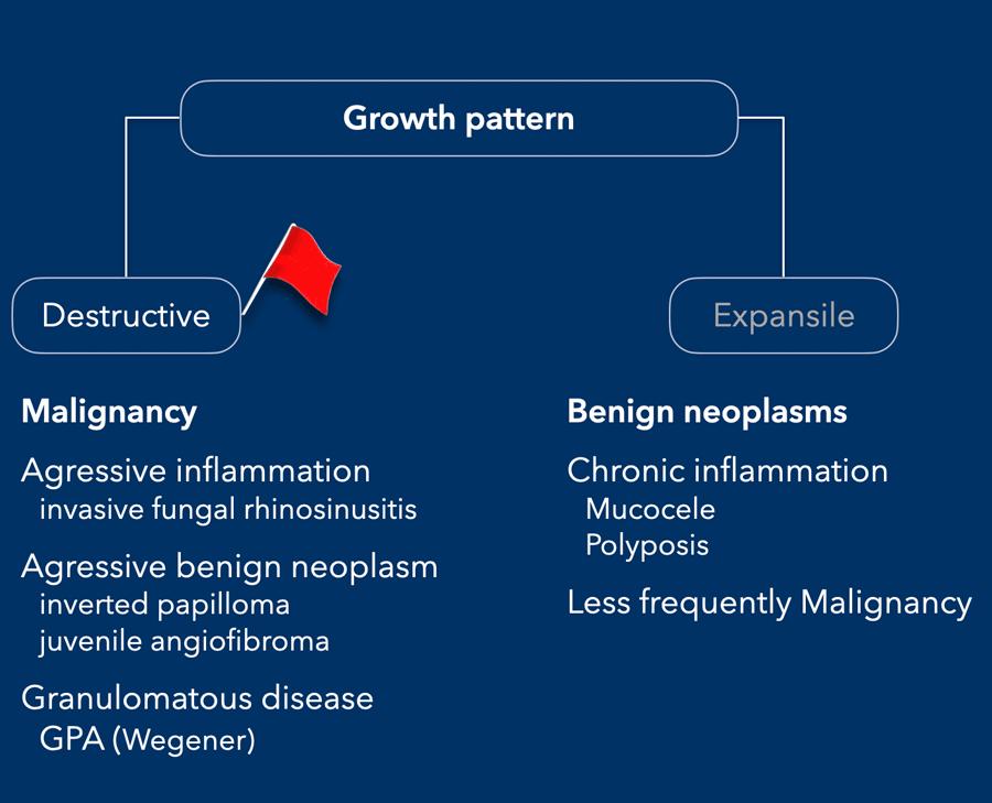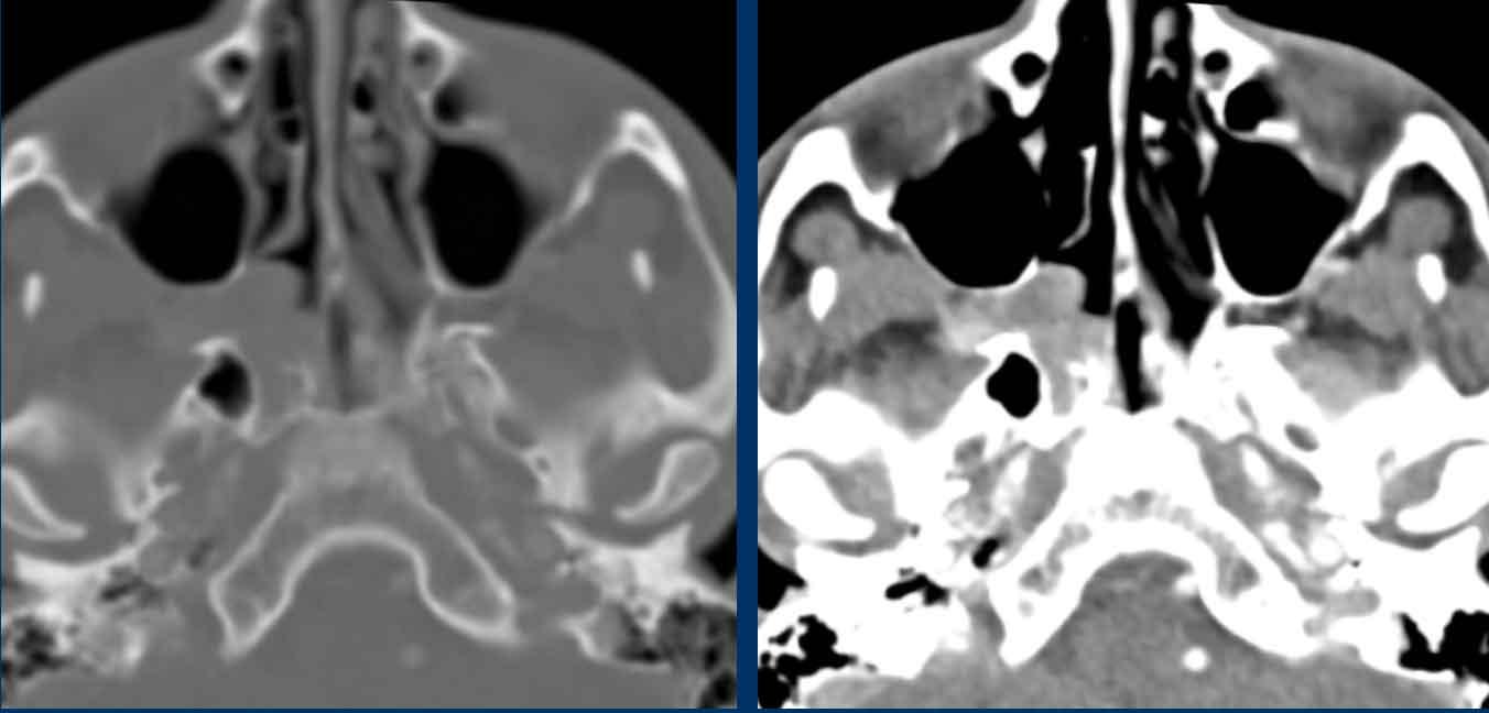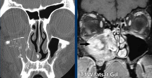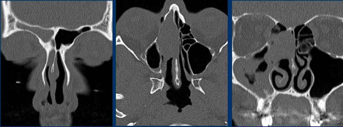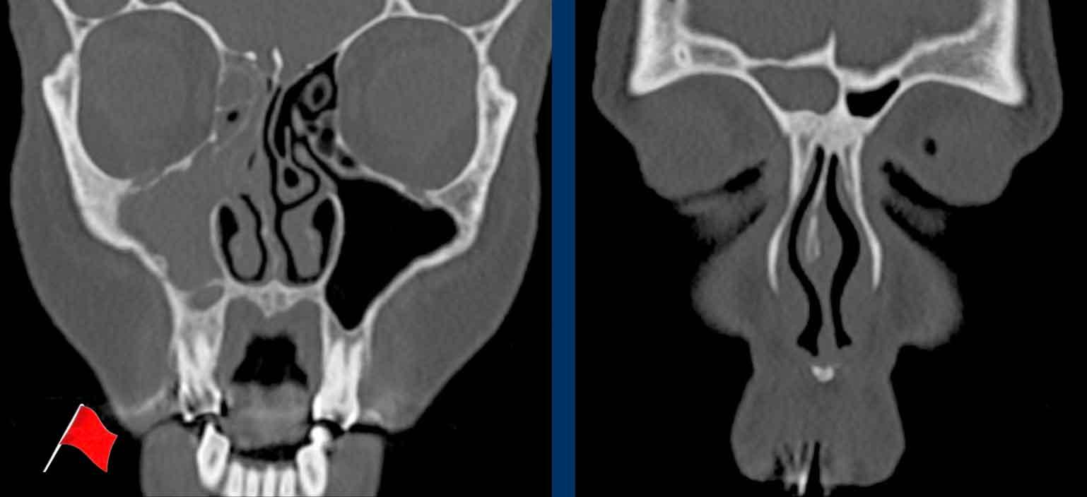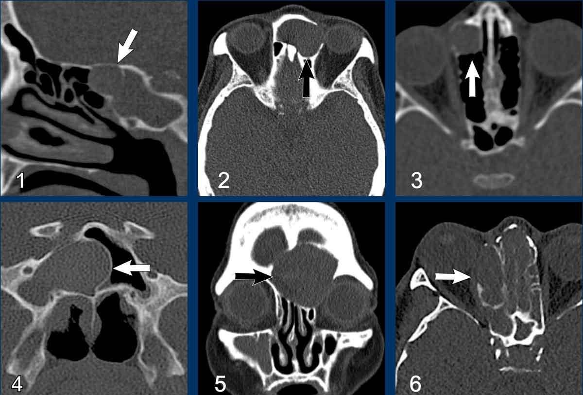 Ở bệnh nhân viêm mũi xoang, có thể có giãn rộng và đôi khi thậm chí phá hủy xương, nhưng bệnh lý (hầu như) luôn luôn xảy ra hai bên.