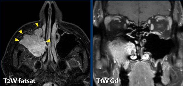 Hình ảnh MRI cho thấy một khối u một bên trong hốc mũi phải gây tắc nghẽn xoang trán và ở mức độ thấp hơn là xoang hàm.