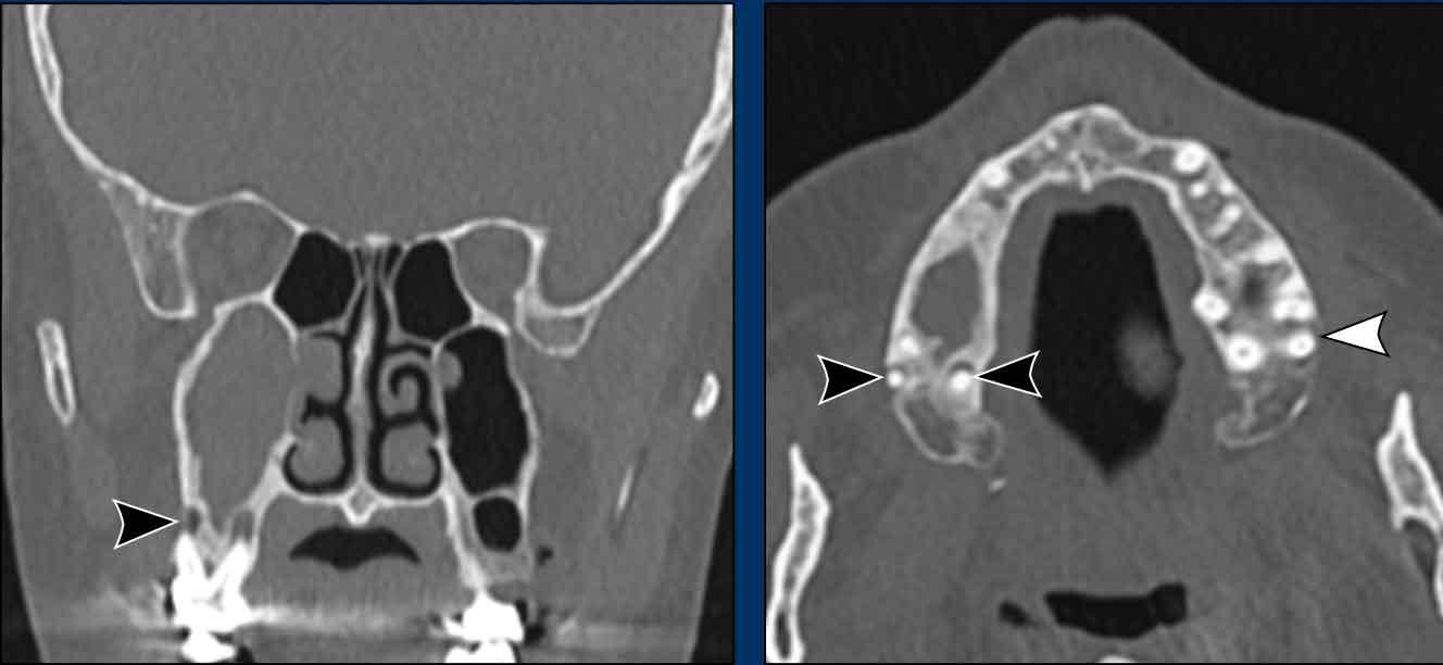 - Phá hủy thành trong xoang hàm (mũi tên đen) và vách mũi (mũi tên trắng).