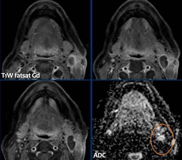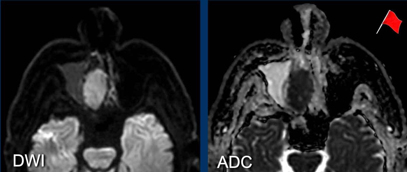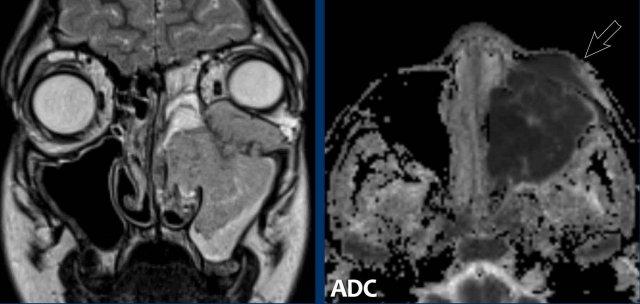 MRI cho thấy một khối u phá hủy một bên với hạn chế khuếch tán rõ rệt (giảm tín hiệu trên bản đồ ADC).