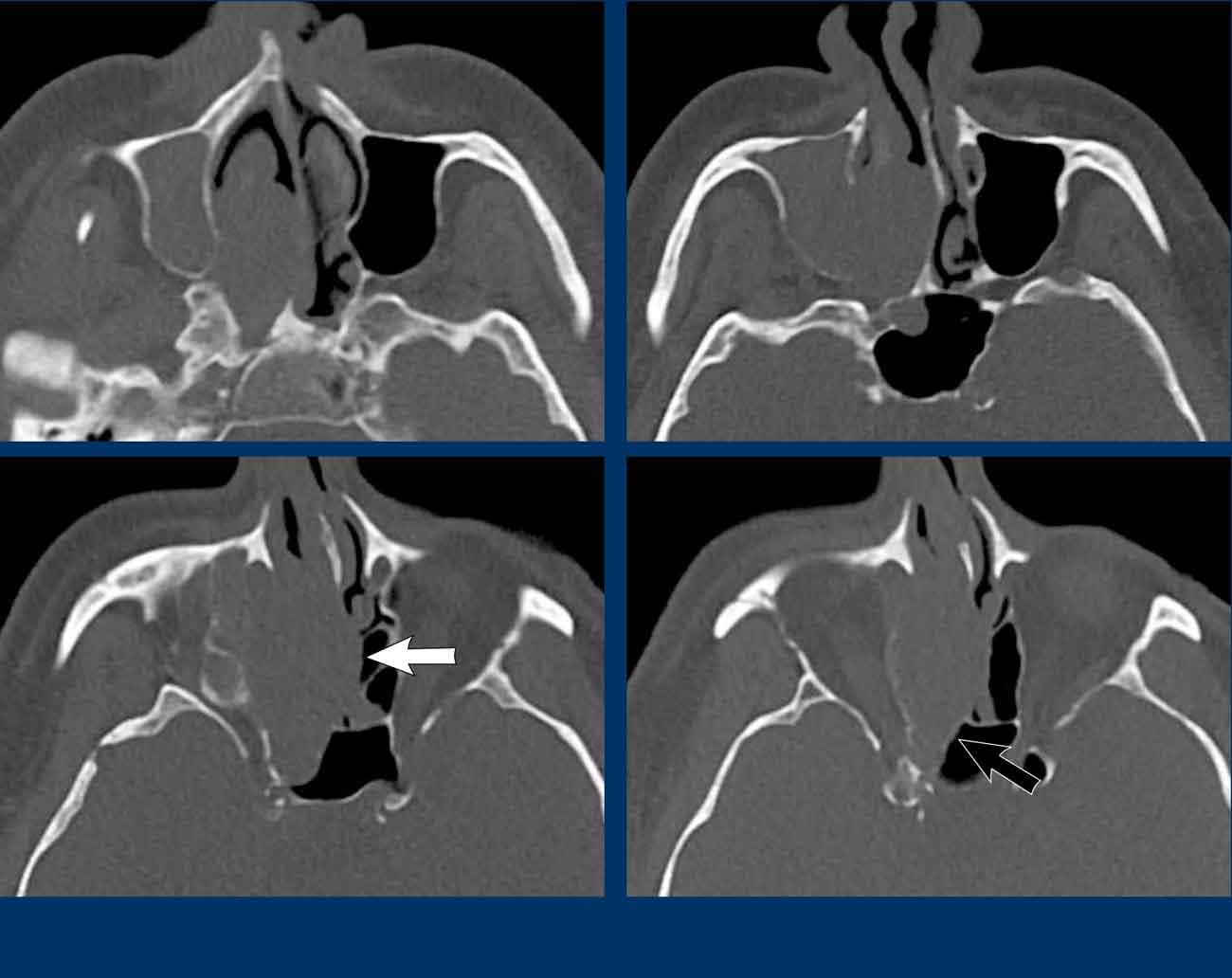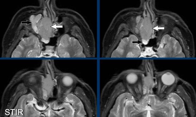 Trên các hình ảnh STIR này, có thể thấy sự khác biệt về cường độ tín hiệu giữa xoang hàm và xoang sàng bị tắc nghẽn (mũi tên đen) và khối u (mũi tên trắng).