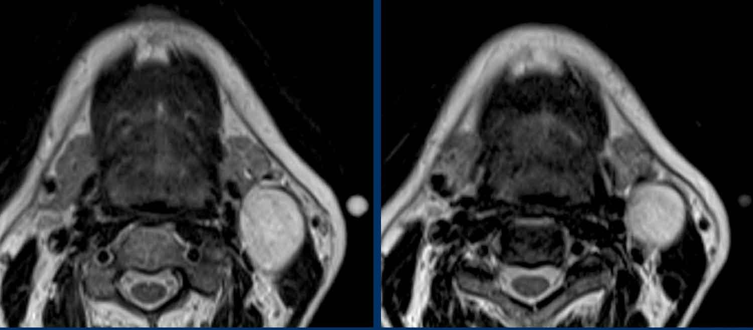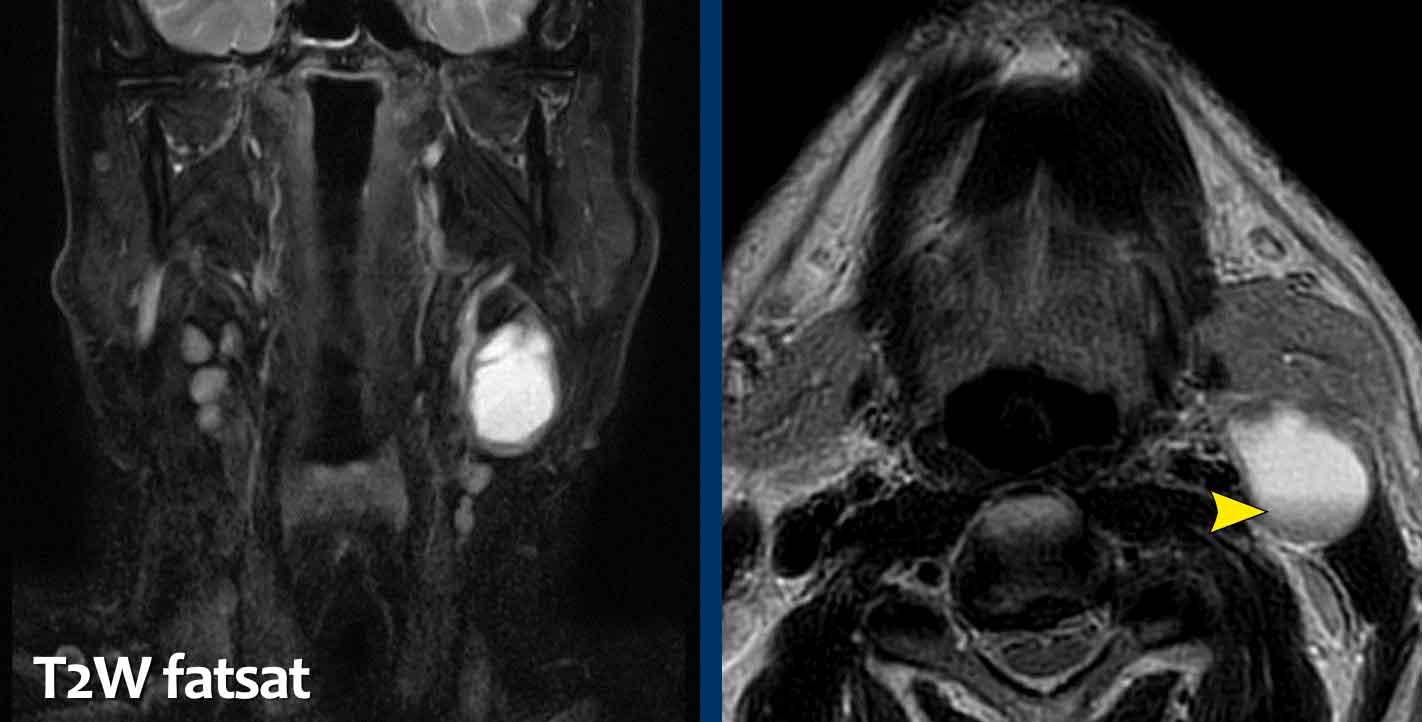 Báo cáo MRI ban đầu ghi nhận có một tổn thương dạng nang nằm phía sau tuyến dưới hàm và phía trước cơ ức đòn chũm; không có hạch bạch huyết kèm theo.
