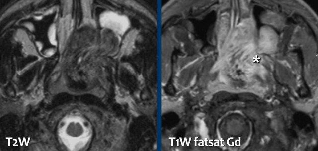 - Đây là bệnh nhân có ung thư biểu mô tế bào vảy xuất phát từ xoang hàm phải, xâm lấn vào hố chân bướm khẩu cái (mũi tên đỏ).