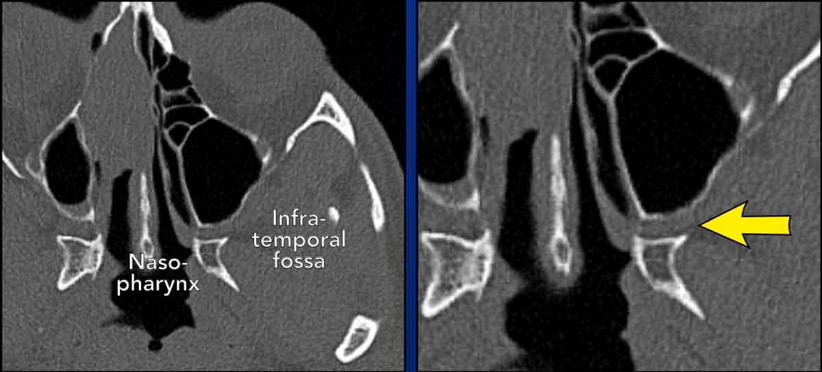Lưu ý mô mỡ bình thường trong hố chân bướm khẩu cái bên trái (mũi tên vàng). - Đây là bệnh nhân nam 16 tuổi của chúng ta.