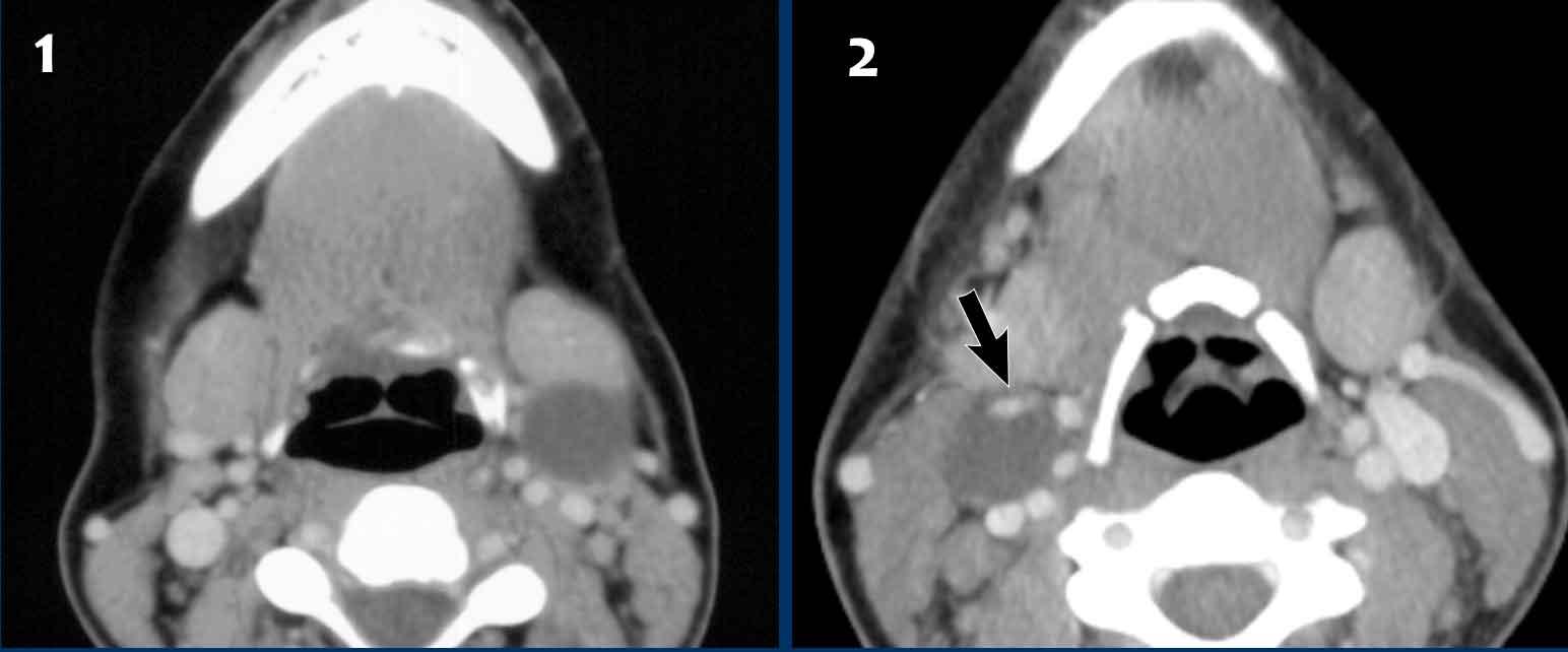 Các hình ảnh này thuộc về một nam bệnh nhân 59 tuổi, có tiền sử hút thuốc lá, nhập viện vì sưng vùng cổ.