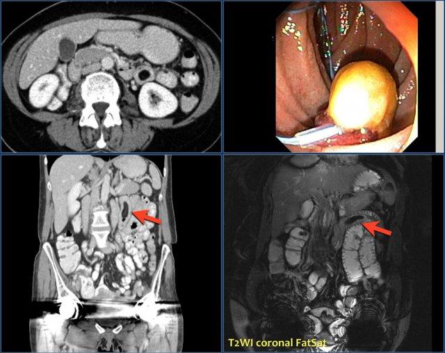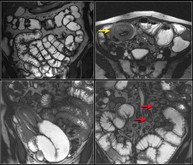 - Lồng ruột hồi-hồi tràng (mũi tên vàng), ở bệnh nhân u lympho ruột non đa ổ (không phải tất cả các tổn thương đều được thể hiện ở đây).
