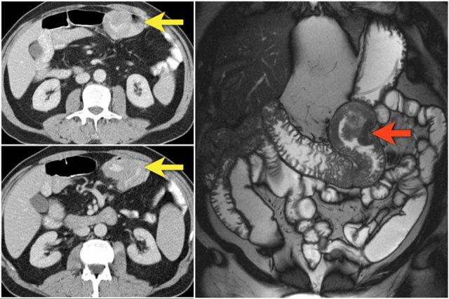Các hình ảnh MRI phía dưới cho thấy cùng khối hỗng tràng đó với bờ dạng vai và hạch to mạc treo (mũi tên đỏ), phù hợp với ung thư biểu mô tuyến.