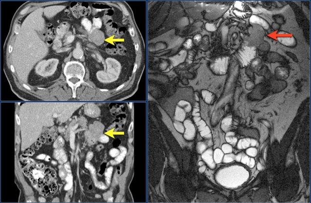 Bệnh nhân này có nhiều khối trong lòng ruột non (mũi tên vàng), được xác định là di căn từ u nguyên phát không rõ nguồn gốc.