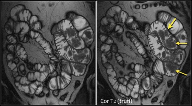 Bệnh Crohn với nhiều tổn thương (mũi tên).