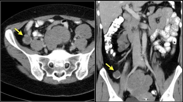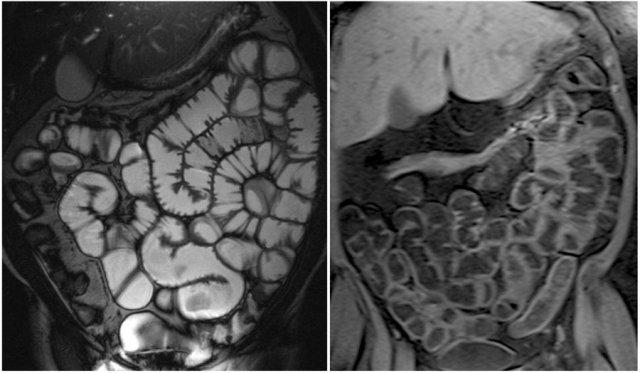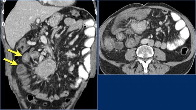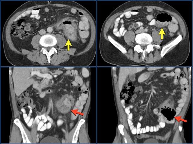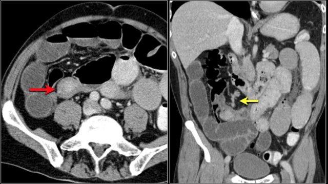 Hình bên phải cho thấy lồng ruột trên mặt phẳng coronal, cùng với một hạch bạch huyết mạc treo phì đại (mũi tên vàng) và di căn gan lan rộng.