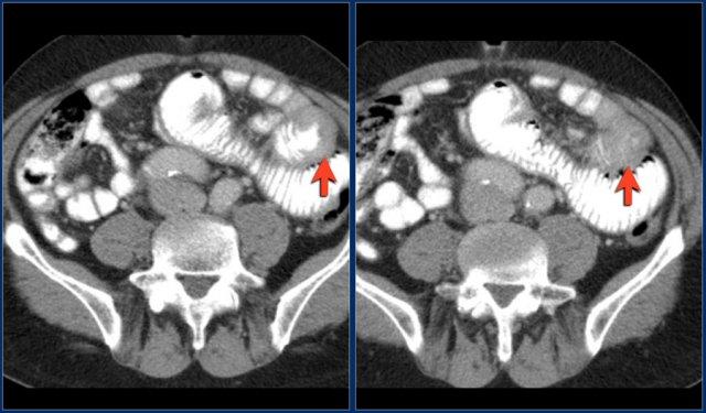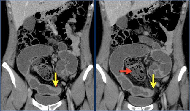 Mũi tên đỏ chỉ vào đại tràng sigma, đang chứa đầy phân. Do đó đây không phải là dấu hiệu phân trong ruột non.