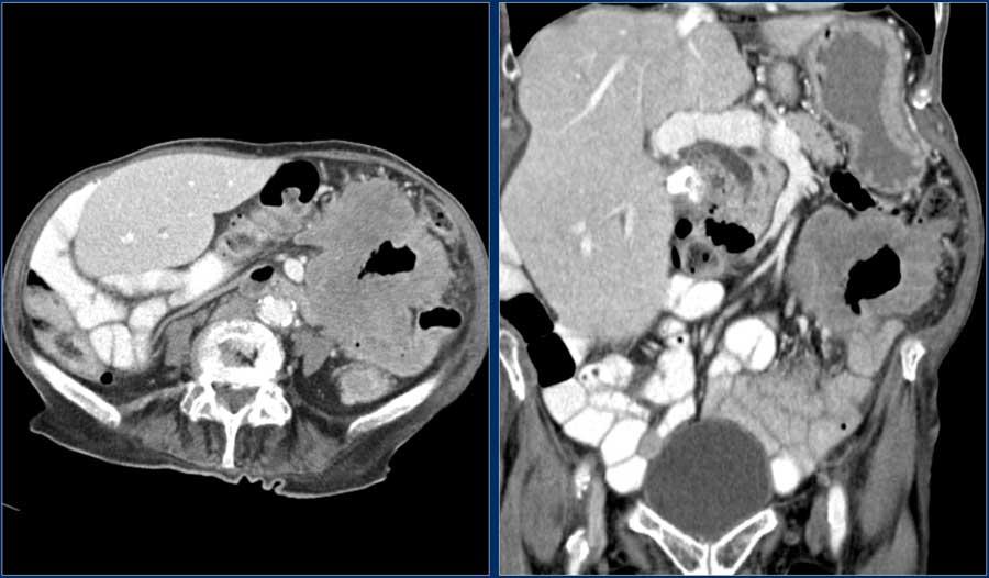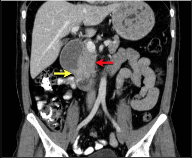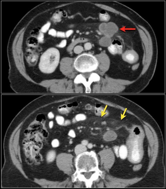Có một khối hạch bạch huyết tập hợp lớn giảm tỷ trọng ở mạc treo lân cận, phù hợp với di căn hạch bạch huyết hoại tử (hình dưới).
