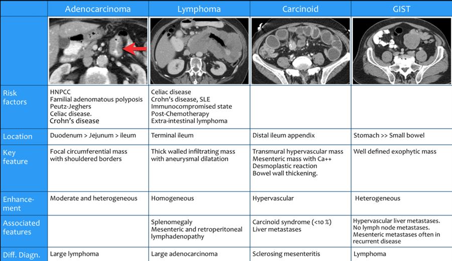 Chẩn đoán phân biệt các khối u ruột non bao gồm nhiều bệnh lý nhiễm trùng và viêm, tất cả đều biểu hiện bằng hình ảnh dày thành ruột khu trú.