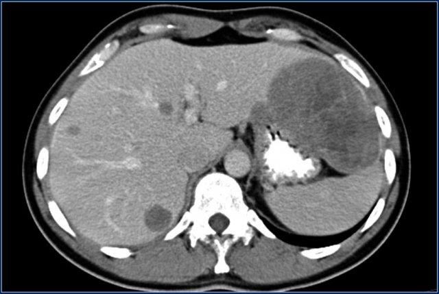 Tái phát bệnh sau phẫu thuật cắt bỏ GIST với hình ảnh các tổn thương di căn gan giảm tỷ trọng và một khối di căn phúc mạc lớn không đồng nhất.