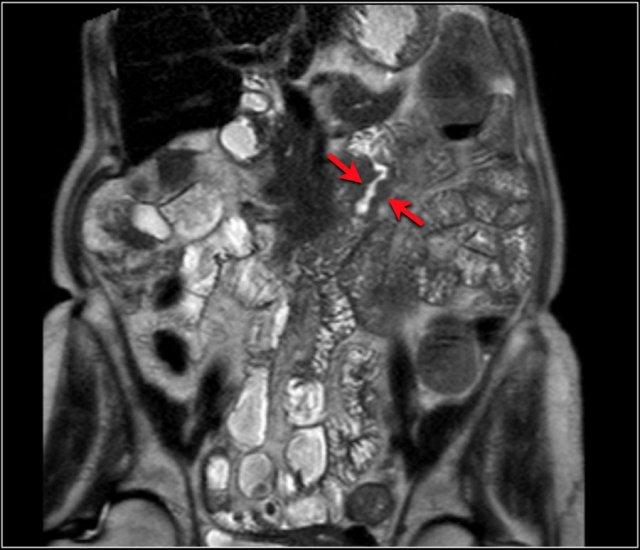 Đây là bệnh nhân có dày thành lan rộng ở đoạn gần hỗng tràng kèm giãn phình dạng túi phình.