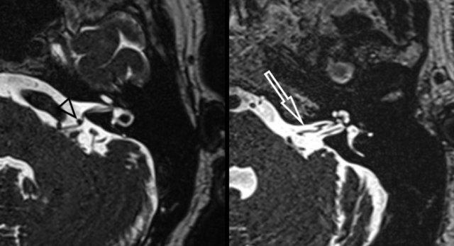 Hình ảnh CISS T2W nặng bên trái cho thấy xung đột thần kinh-mạch máu của động mạch tiểu não sau dưới với sự chèn ép và di lệch dây thần kinh mặt và dây thần kinh tiền đình-ốc tai (hình bên trái, đầu mũi tên đen).
