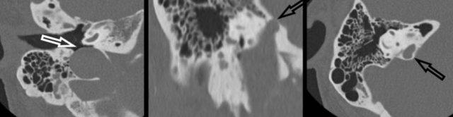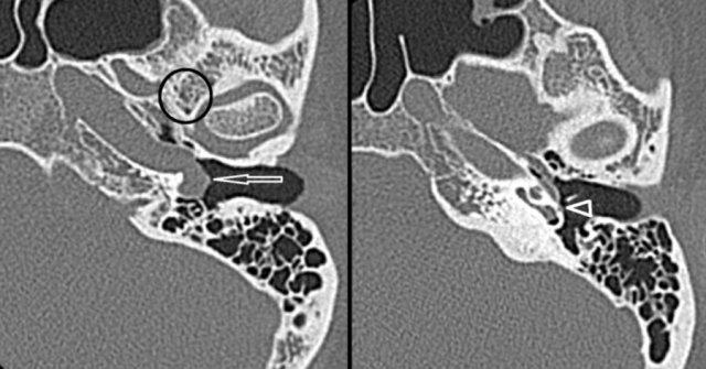 Xơ cứng tai: xương giảm tỷ trọng ở vùng fissula ante fenestram trong xơ cứng tai thể cửa sổ (trái). Xơ cứng tai thể ốc tai biểu hiện là một vùng hào quang giảm tỷ trọng bao quanh ốc tai trên CT (phải).