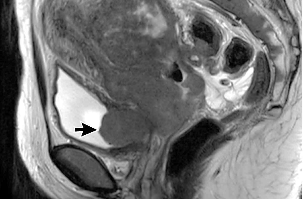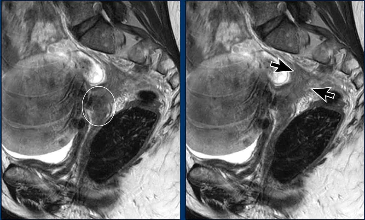 Hình MRI mặt phẳng đứng dọc này cho thấy ung thư cổ tử cung tiến triển tại chỗ (vòng tròn) với xâm lấn lan rộng dọc theo các dây chằng tử cung-cùng (mũi tên).