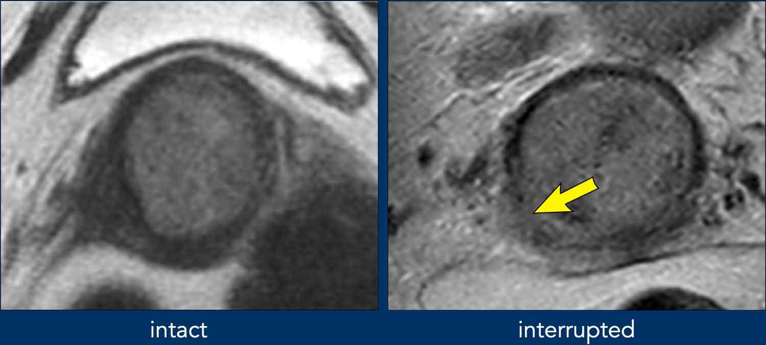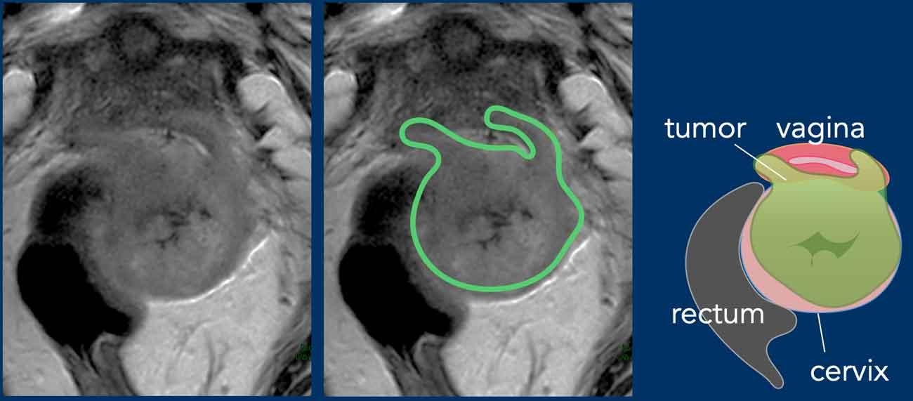 Khi vòng mô đệm giảm tín hiệu của cổ tử cung còn nguyên vẹn (hình bên trái), MRI có thể dự đoán sự vắng mặt của xâm lấn cạnh cổ tử cung với giá trị tiên đoán âm cao hơn 90%.
