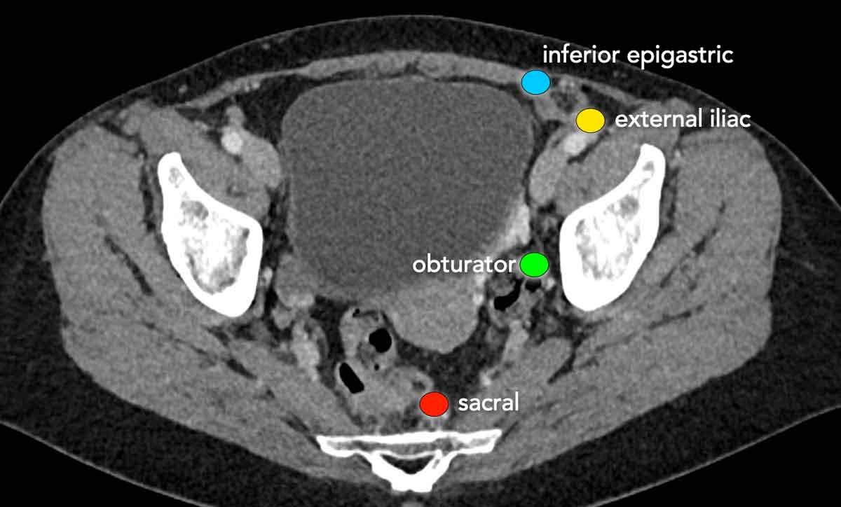 Có một hạch 7 mm ở mặt sau tĩnh mạch chậu ngoài phải (mũi tên trắng) không xác định được trên MRI.