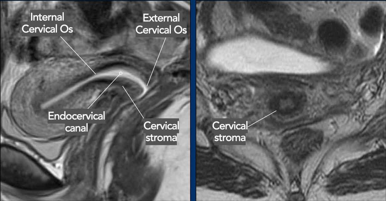 Tương tự như tử cung, cổ tử cung thể hiện các lớp cấu trúc riêng biệt trên chuỗi xung T2W MRI.
