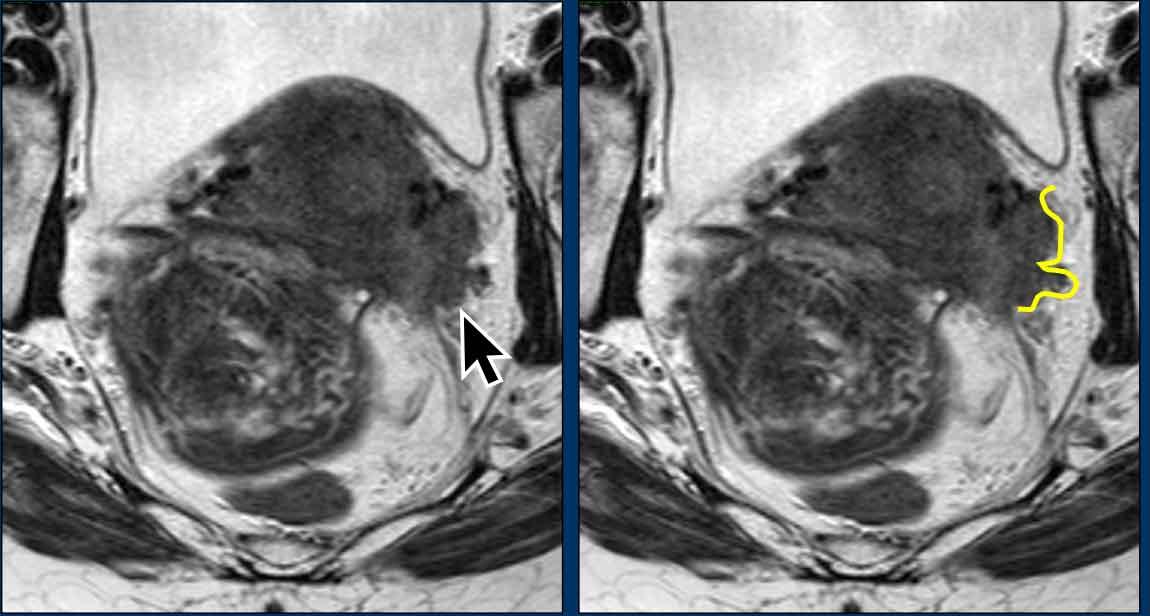Lưu ý rằng không có xâm lấn thực sự vào vùng cạnh cổ tử cung vì vòng mô đệm giảm tín hiệu của cổ tử cung hoàn toàn còn nguyên vẹn như được chỉ ra bởi các đầu mũi tên.