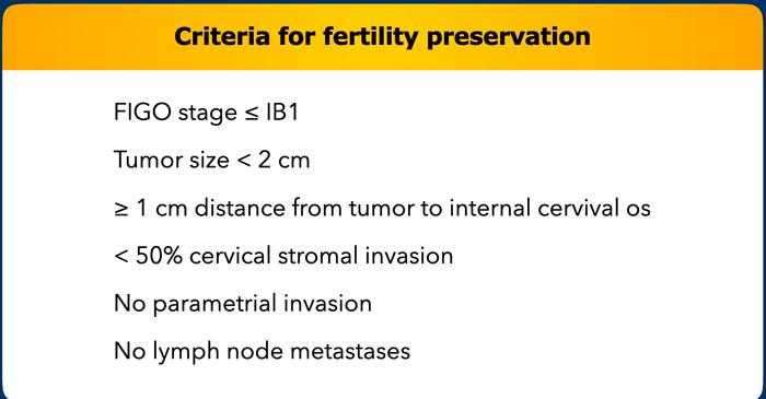 Phẫu thuật bảo tồn khả năng sinh sản (cắt cổ tử cung) có thể được chỉ định cho các bệnh nhân được chọn lọc mắc ung thư cổ tử cung giai đoạn sớm, dựa trên các tiêu chí được trình bày trong Bảng.