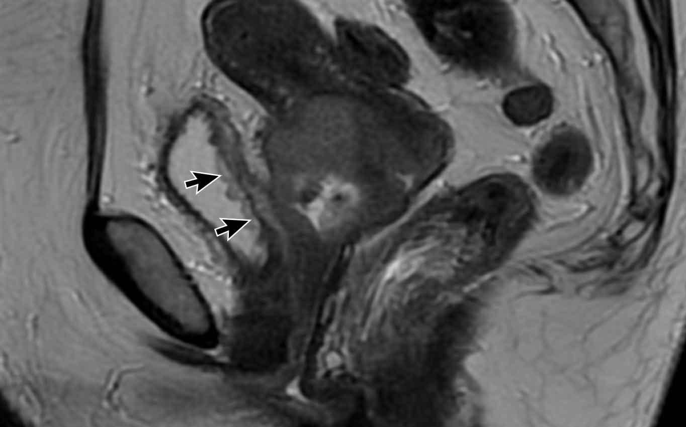Xâm lấn thành âm đạo có thể được nhận biết trên MRI chuỗi xung T2W như sự lan rộng của mô mềm tương đối tăng tín hiệu vào trong thành âm đạo.