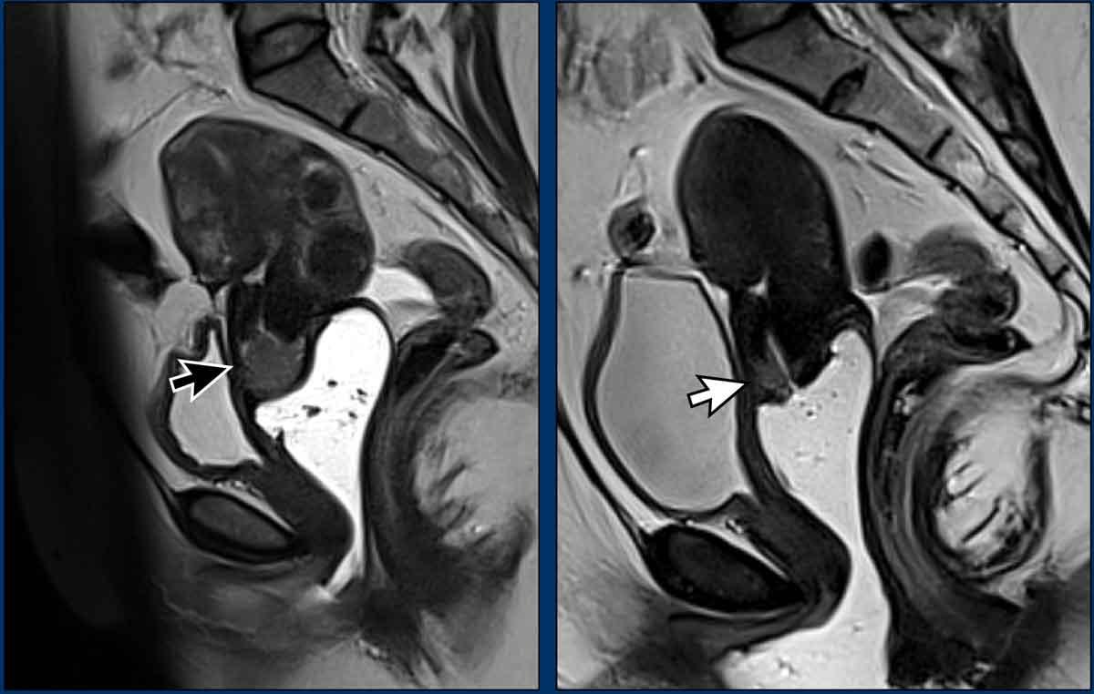 Lưu ý rằng trong hình ảnh bên phải, nơi có khối nội cổ tử cung, khối này gây tắc nghẽn ống cổ tử cung với sự giãn rộng của buồng tử cung chứa đầy dịch tăng tín hiệu và máu đồng tín hiệu tạo thành đường phân cách dịch-máu.