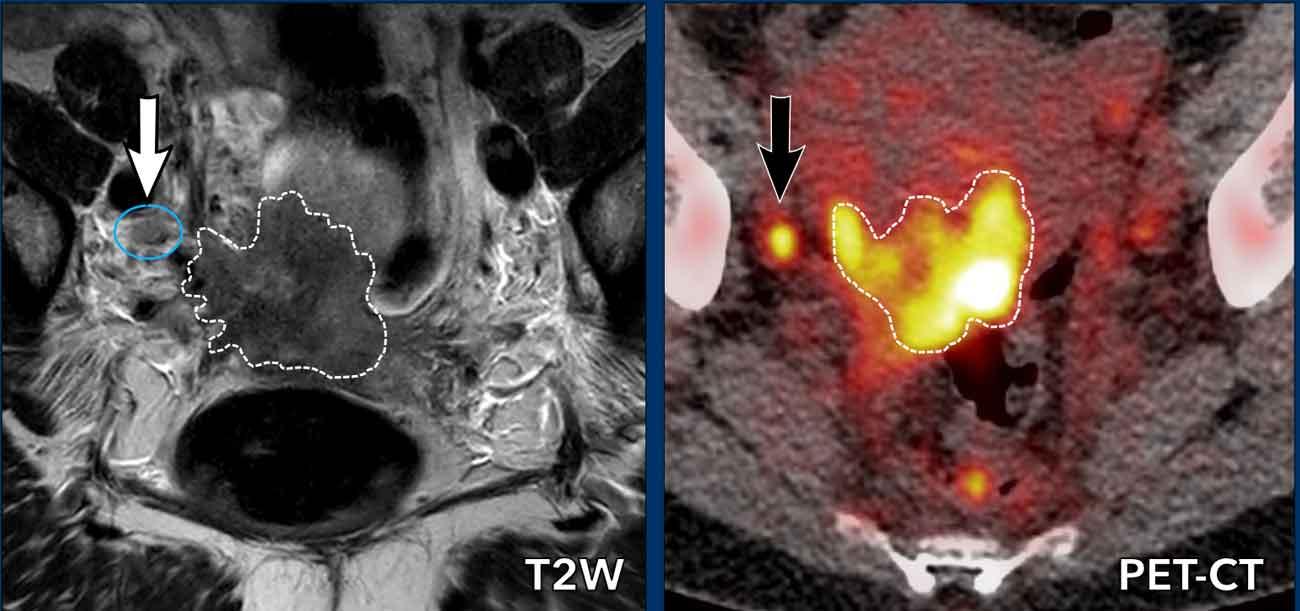 Trên PET/CT tương ứng, khối u nguyên phát bắt FDG rõ ràng, cũng như hạch cạnh chậu nhỏ (mũi tên đen), qua đó chẩn đoán là N+.