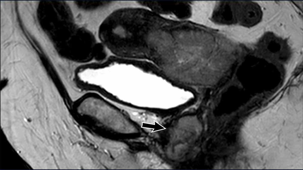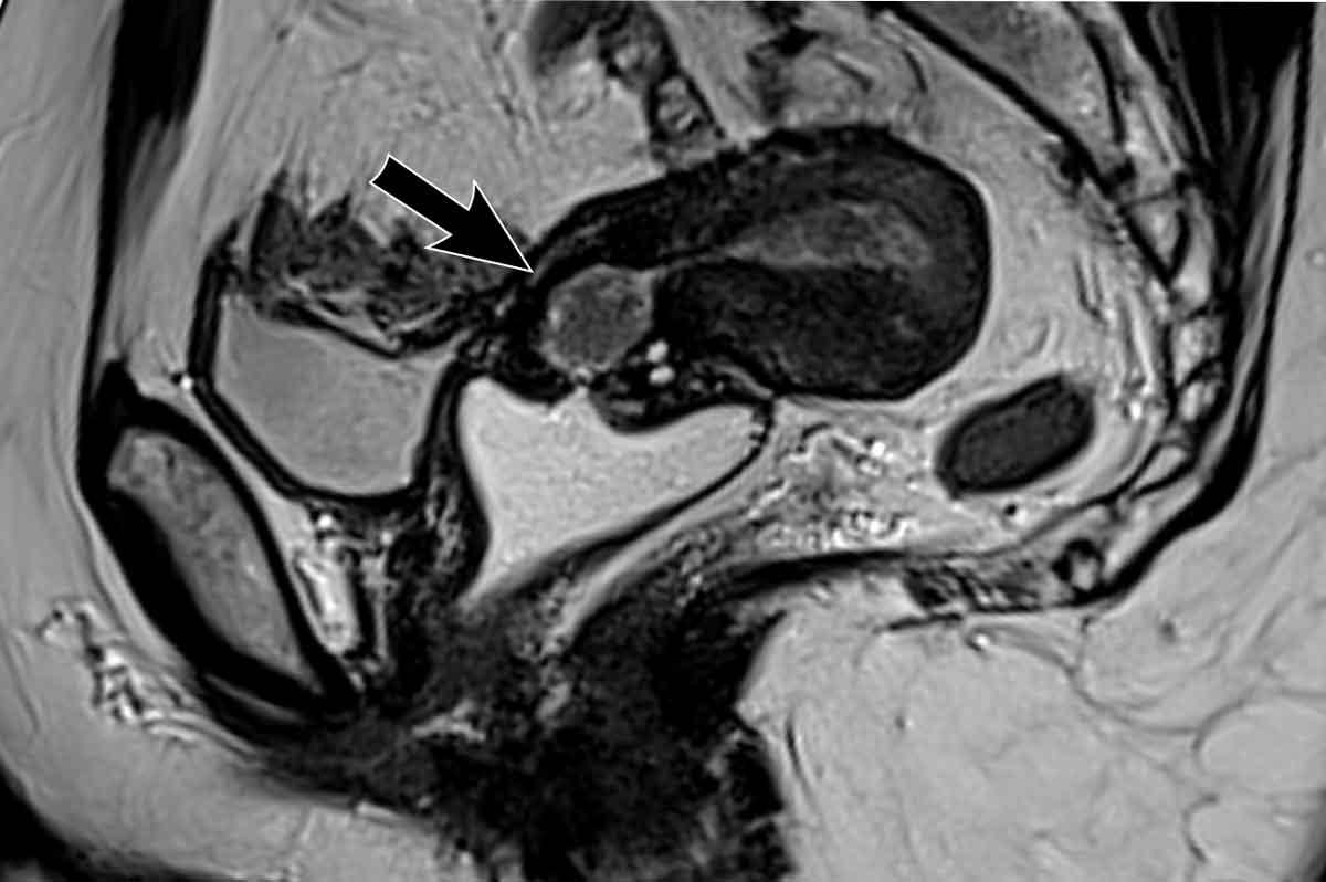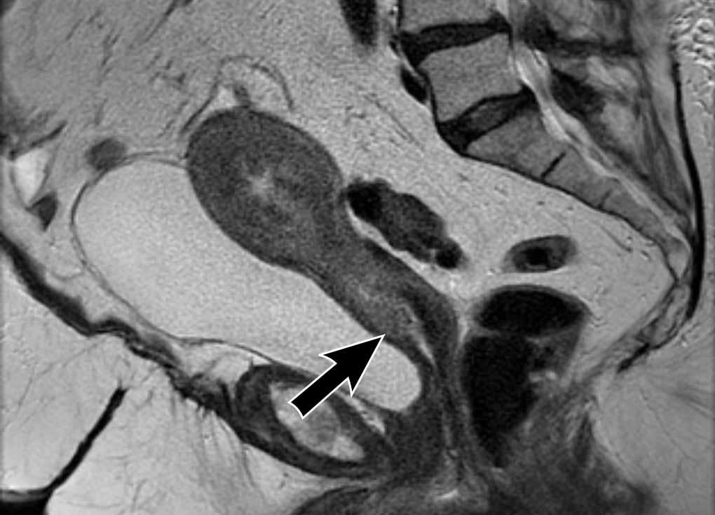 Có sự lan rộng của tín hiệu trung gian của khối u làm gián đoạn tín hiệu giảm bình thường của cổ tử cung (mũi tên).