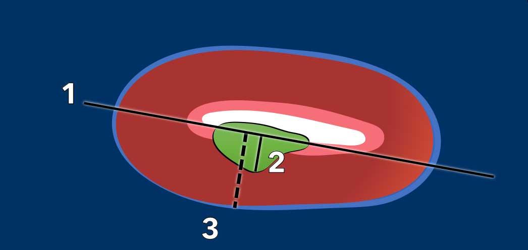 Trong trường hợp này, đường kính dài nhất của khối u được quan sát rõ nhất trên mặt phẳng ngang (axial) (hình).