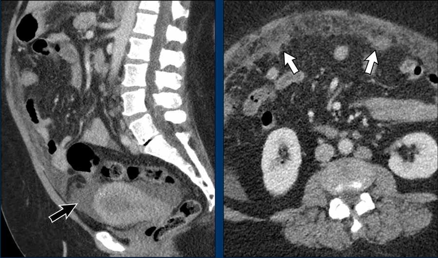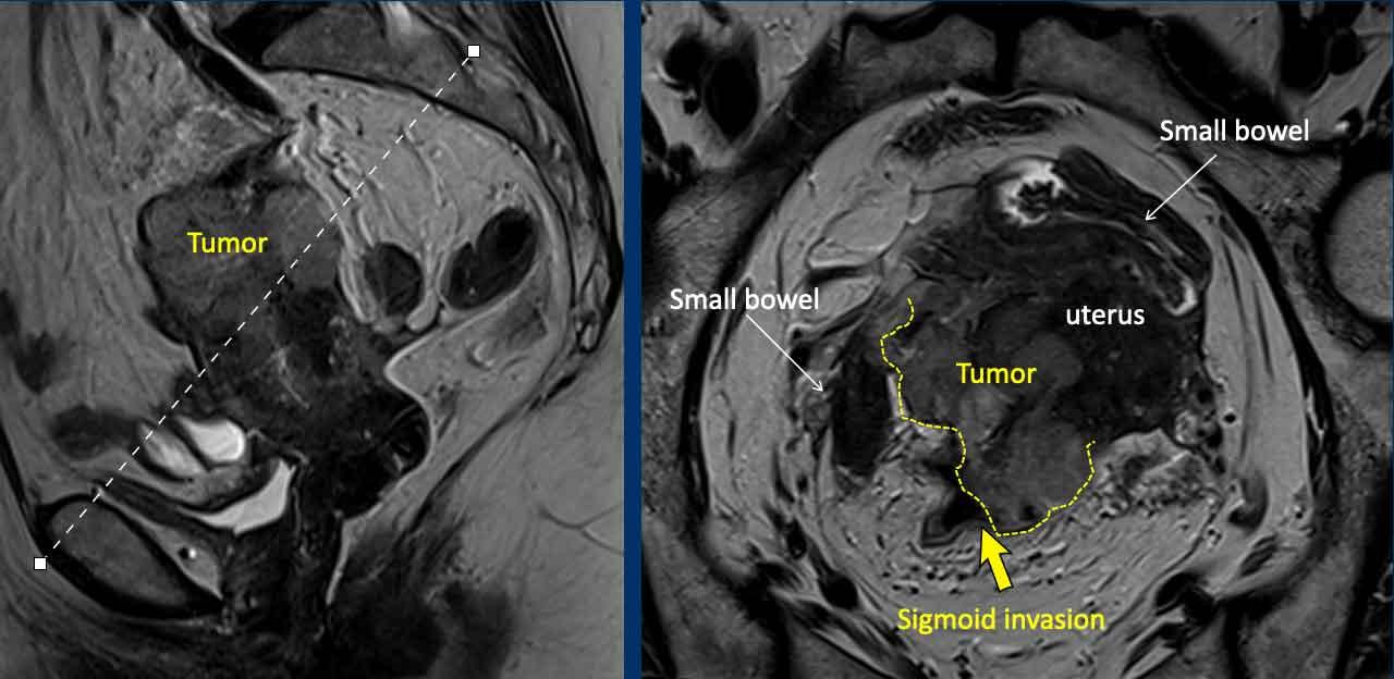 Đây là một ví dụ hiếm gặp về ung thư nội mạc tử cung tiến xa tại chỗ, phát triển vượt qua thanh mạc tử cung ở phía sau và xâm lấn đại tràng sigma (mũi tên).