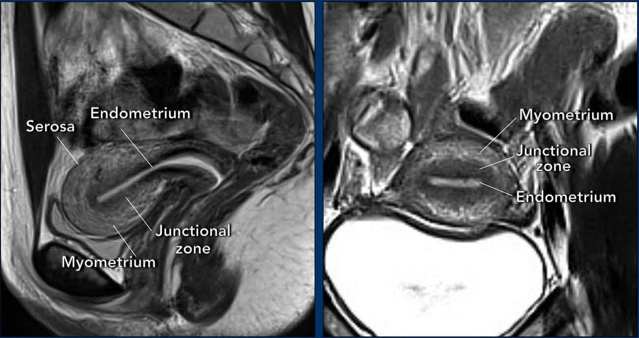 Trong độ tuổi sinh sản, có thể nhận diện ba lớp vùng riêng biệt: lớp nội mạc tử cung (tăng tín hiệu), vùng tiếp hợp (giảm tín hiệu) và lớp cơ tử cung (tín hiệu tương đối cao).