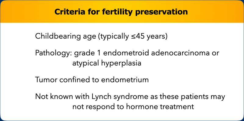 Đối với ung thư nội mạc tử cung, điều trị bảo tồn khả năng sinh sản bao gồm liệu pháp hormone, vốn không được xem là phác đồ điều trị tiêu chuẩn.
