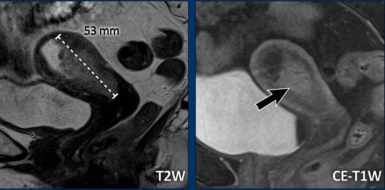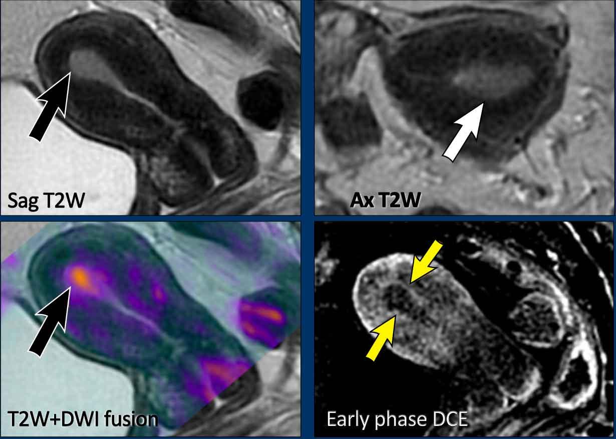 Trong trường hợp này, đường dưới nội mạc còn nguyên vẹn trên hình ảnh DCE pha sớm (các mũi tên), cho thấy không có xâm lấn cơ tử cung.