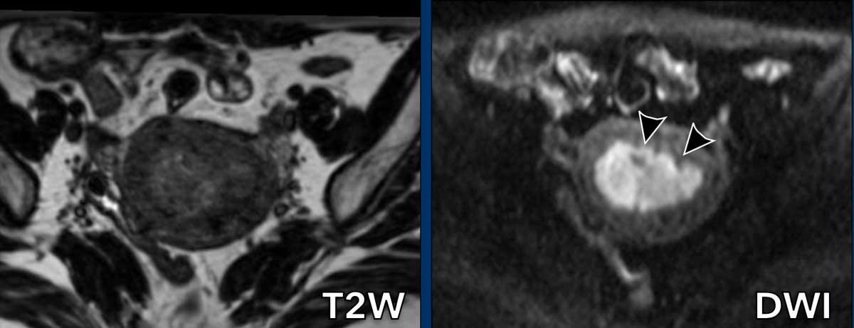 Trong những trường hợp như vậy, DWI giúp phân biệt giữa khối u và cơ tử cung.
