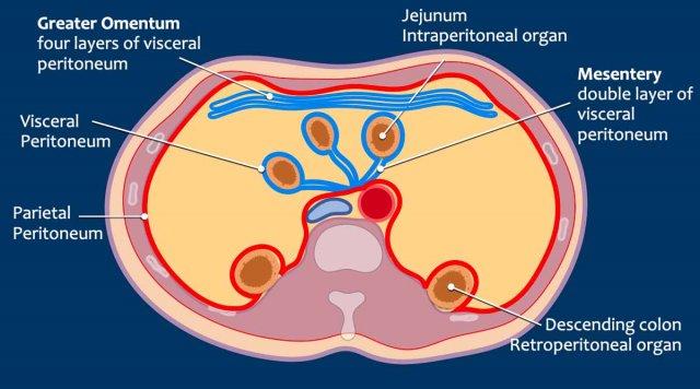 Phúc mạc tạng là lớp trong, bao phủ các tạng trong ổ bụng (màu xanh).