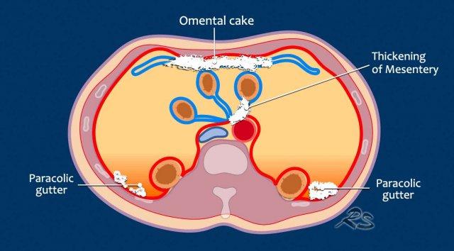 Các tổn thương di căn mạc treo ruột có thể được quan sát rõ khi mạc treo được bao quanh bởi dịch cổ trướng.