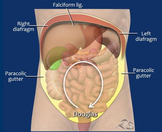 Nguyên nhân là do dòng chảy theo chiều kim đồng hồ của dịch trong ổ bụng về mặt sinh lý, xuất phát từ sự thay đổi áp lực trong ổ bụng trong quá trình hô hấp.