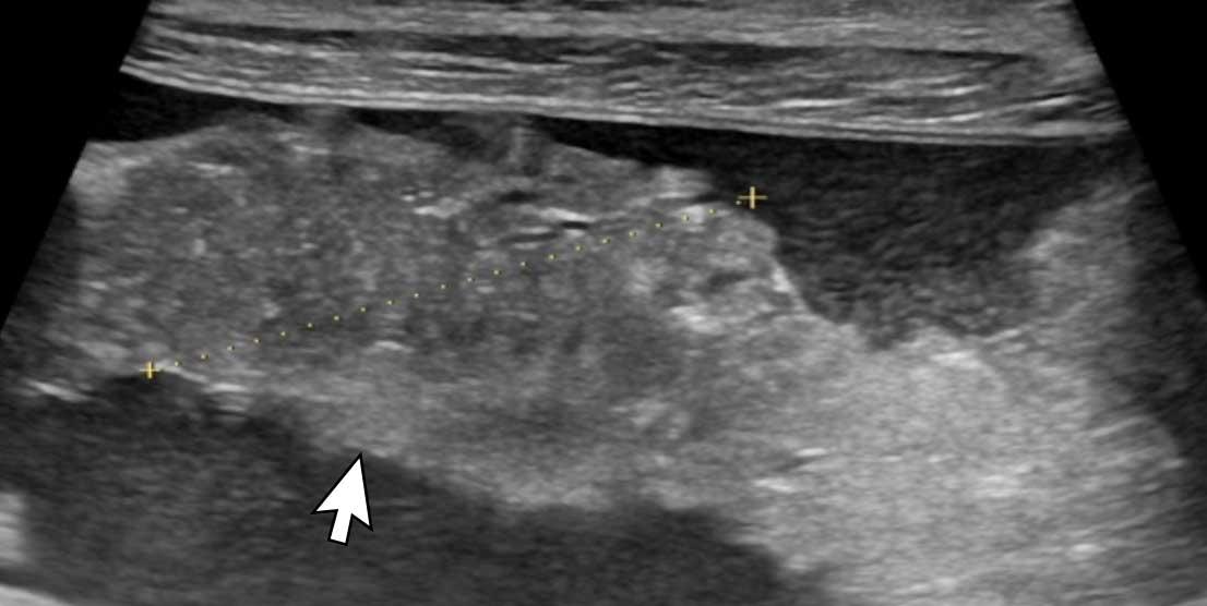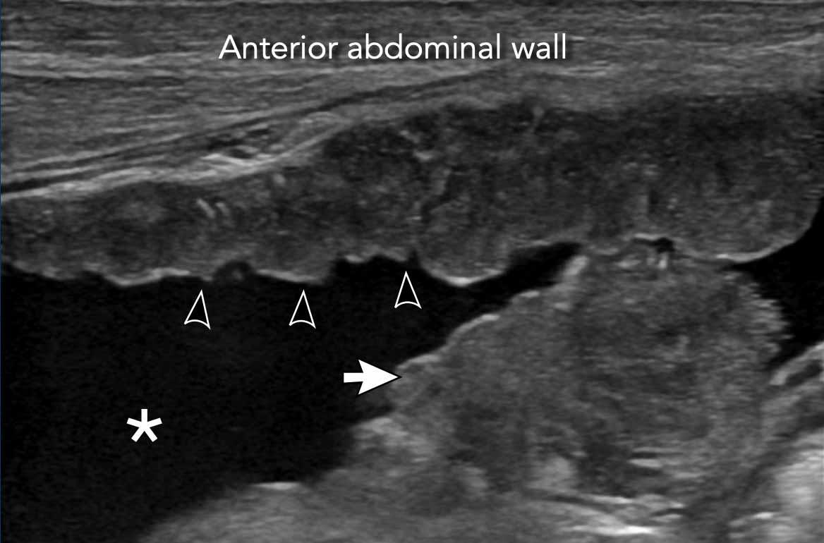 Hình ảnh siêu âm của một bệnh nhân nhập viện với cổ trướng (dấu hoa thị) cho thấy cả các nốt khối u trên phúc mạc thành (đầu mũi tên) lẫn một khối u lớn trên phúc mạc tạng (mũi tên trắng).