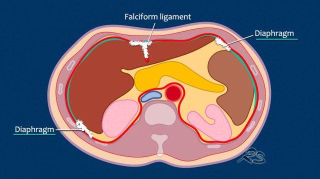 Ở vùng bụng trên, cơ hoành và dây chằng liềm cần được chú ý đặc biệt.