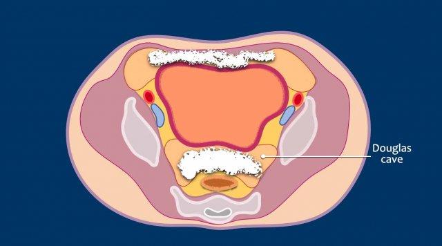 Ở vùng chậu, vị trí quan trọng nhất là túi cùng trực tràng-tử cung và trực tràng-bàng quang (túi cùng Douglas).