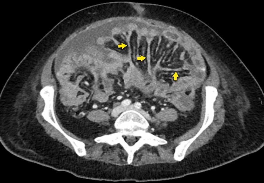 Trên CT, hình ảnh dày mạc treo ruột cũng có thể được ghi nhận.