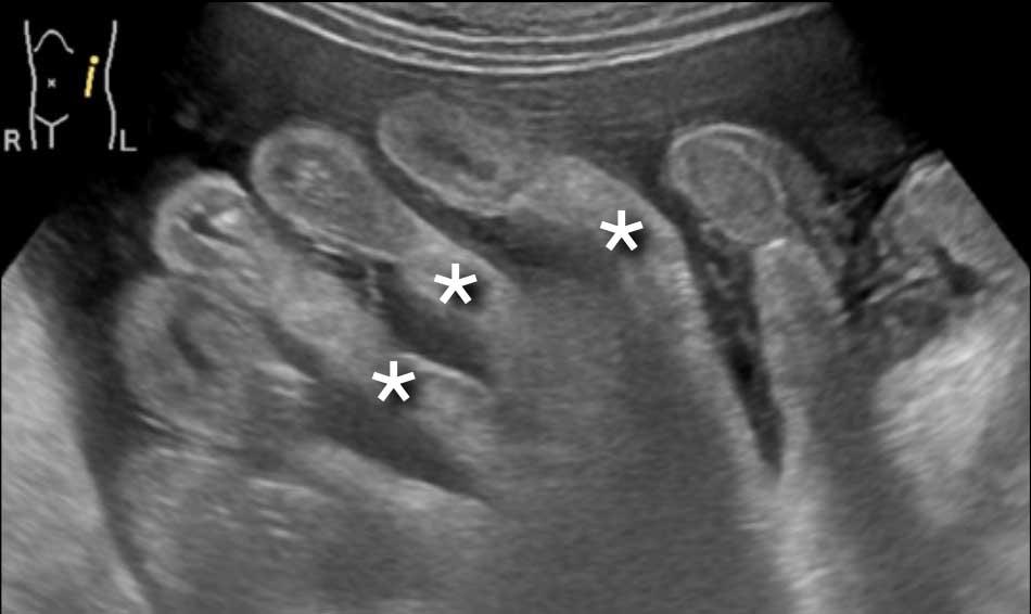 Cả siêu âm và CT đều có thể hiển thị hình ảnh dày các lớp phúc mạc của mạc treo ruột.